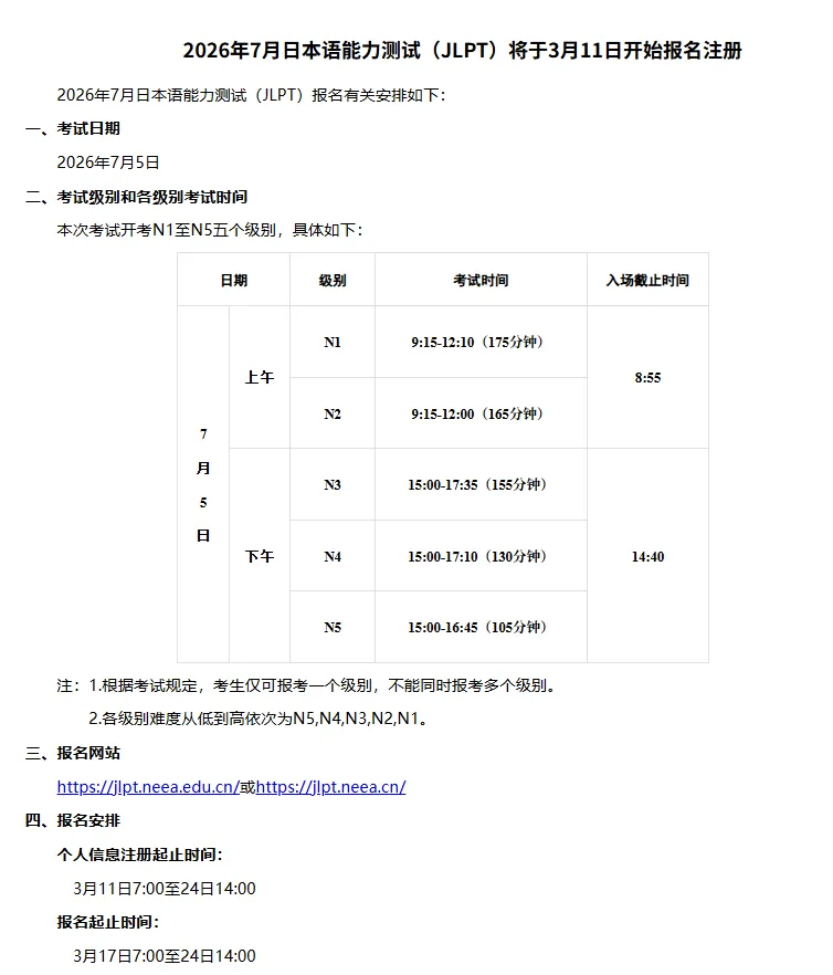 2026年7月日本语能力测试(JLPT)将于3月11日 7:00正式开放注册,3月17日 7:00开始缴费报名。